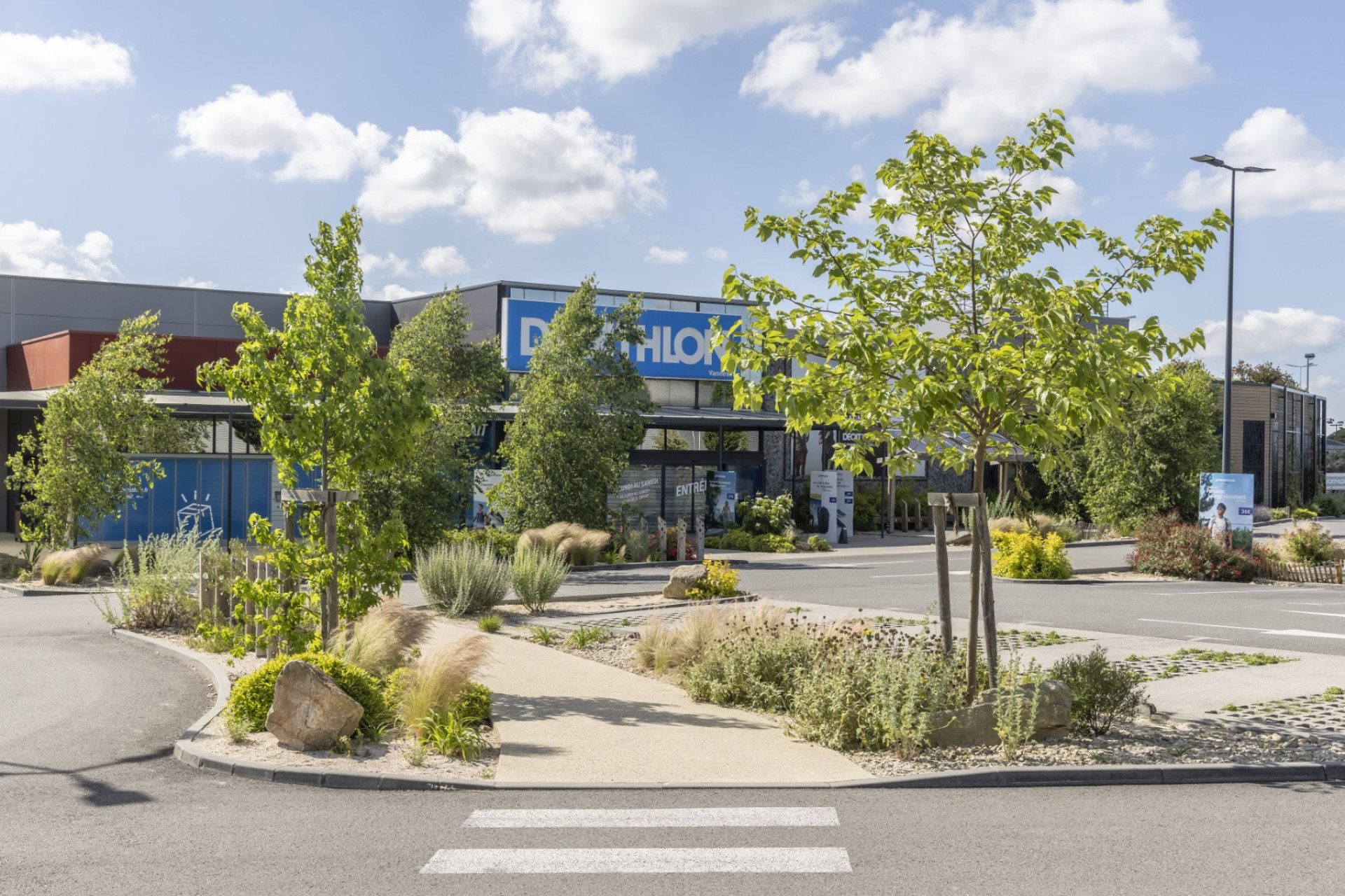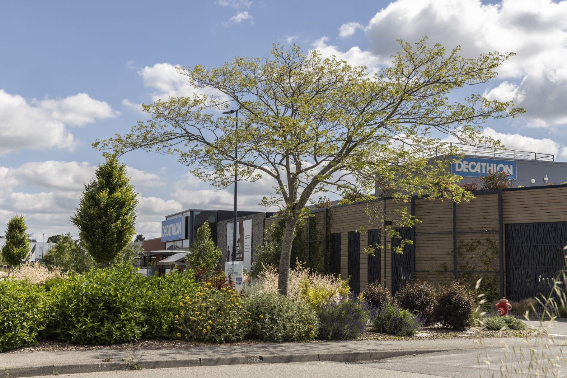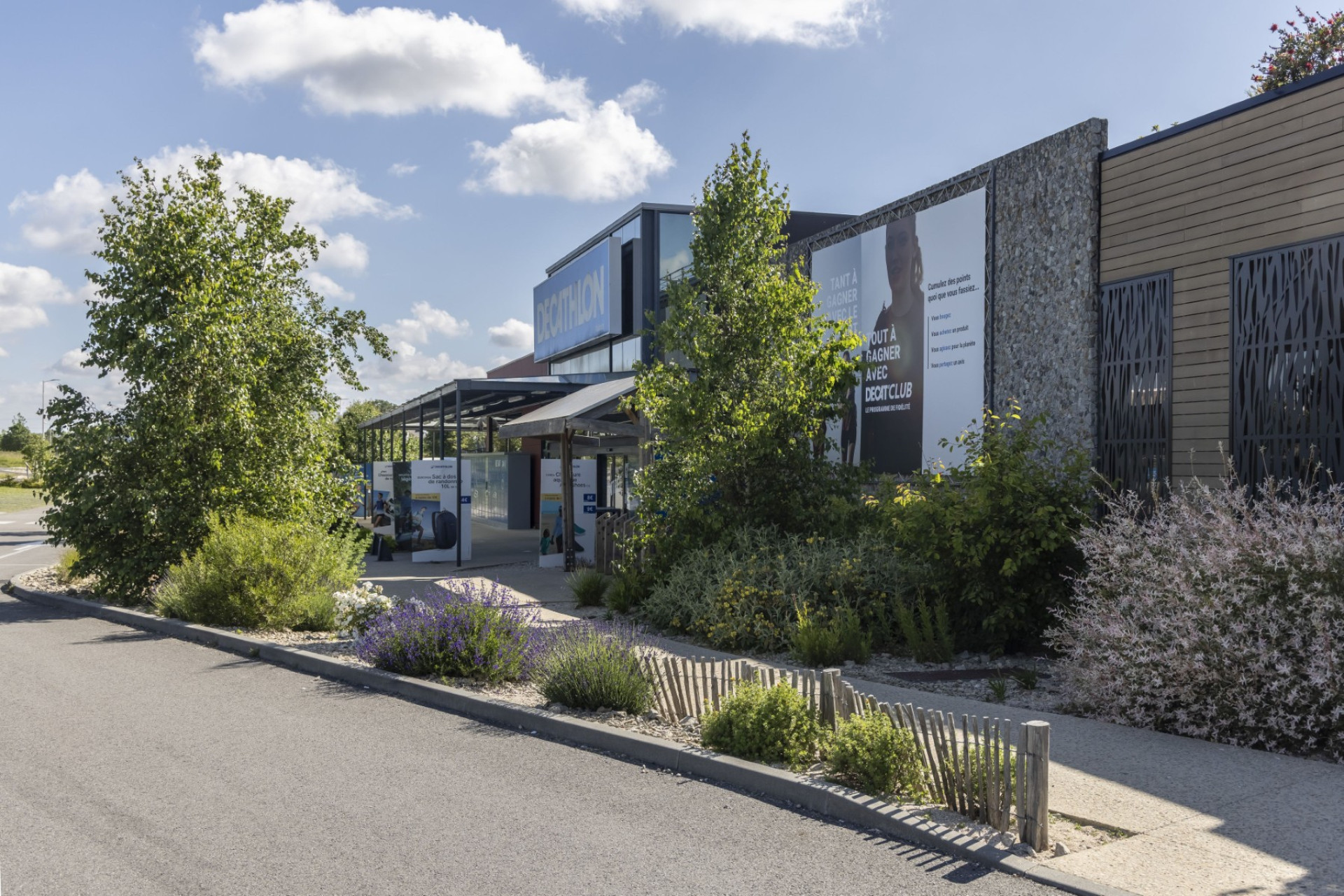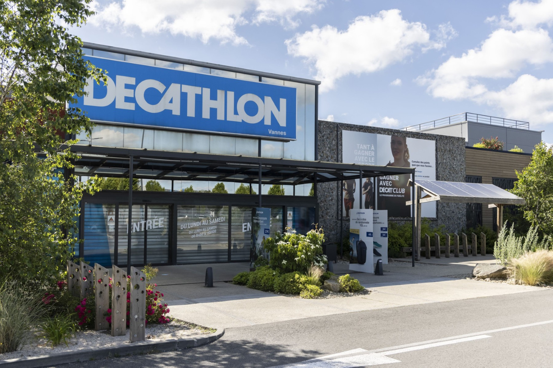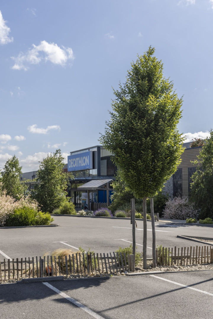 En transformant son parking, Decathlon Vannes a créé un véritable îlot de fraîcheur. Arbres et plantes grimpantes sur la façade du parvis témoignent de son engagement pour réduire la chaleur urbaine et rendre vos visites plus agréables.